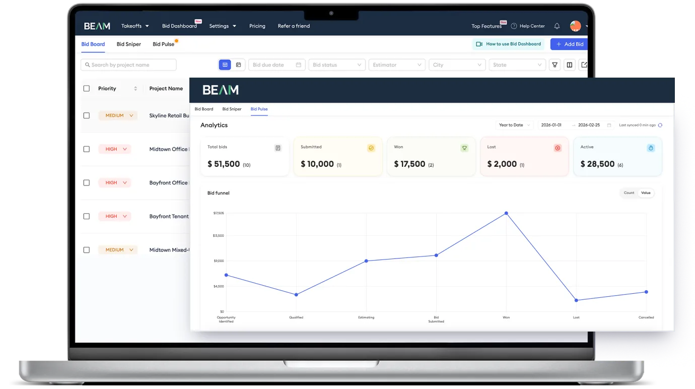 Beam AI’s bid dashboard gives you a single, organized space to track bid statuses, due dates, addenda, RFIs, and ITBs. It also sends automatic reminders ahead of every deadline—so you can finally replace messy spreadsheets and whiteboards for good.