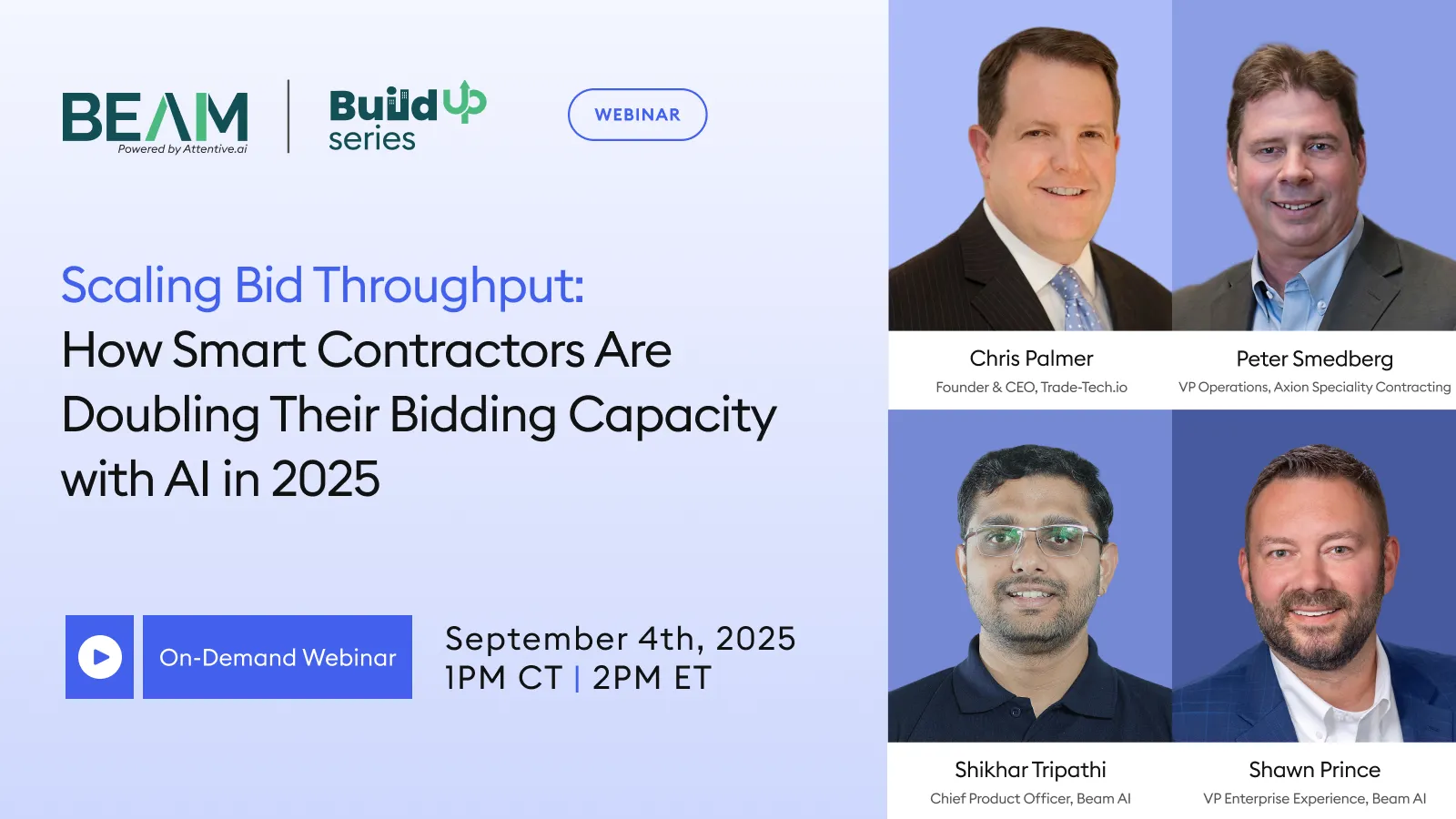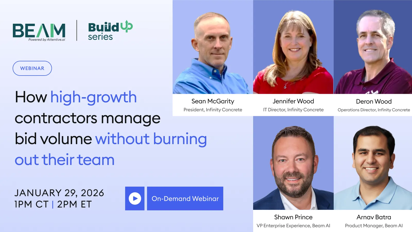 Contractors are seeing more ITBs than ever, but higher bid volume isn’t translating into better outcomes. In this session, leaders from Infinity Concrete and Beam AI share how high-growth teams scale bid throughput without burnout, by rethinking capacity, roles, and workflows.
